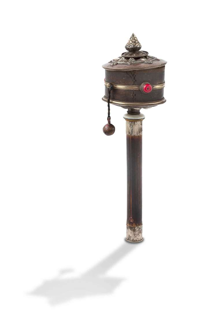 Moulin à prière en alliage cuivreux, cuir et cabochons de corail et turquoise.