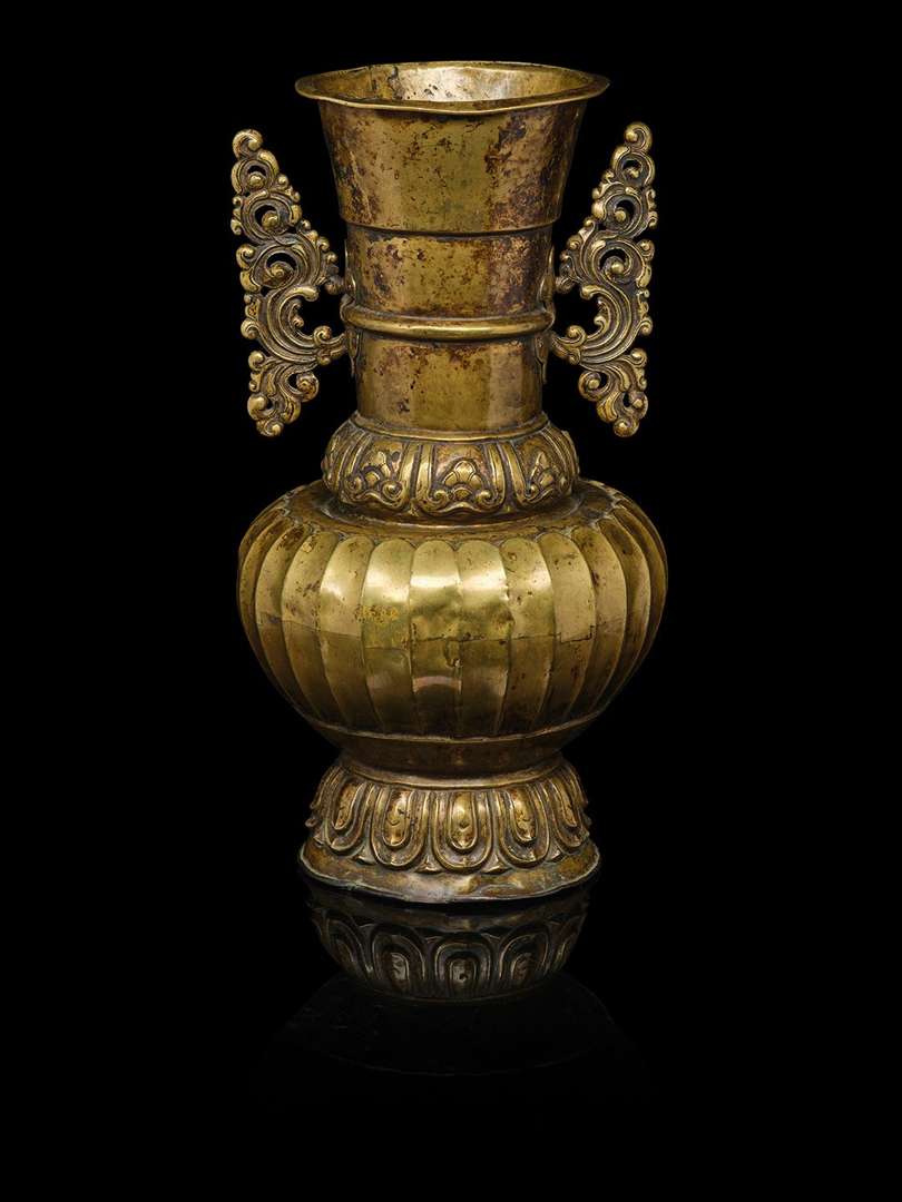 Important vase cérémoniel en bronze repoussé reposant sur un pied évasé à décor de pétales de lotus, la panse godronnée surmontée d'un haut col évasé décoré de pétales et flanqué de deux anses formées de rinceaux stylisés.