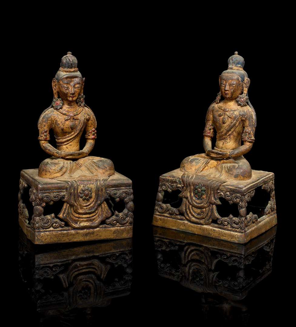 Deux statuettes d'Amitayus en alliage cuivreux laqué doré. Chacun assis en padmasana sur de hautes bases quadrangulaires, les mains en dhyana mudra, vêtus de fins dhoti retombant sur l'avant de la base, parés de bijoux, la chevelure relevée en haut chignon.