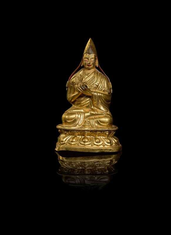 Statuette de Tsongkhapa en alliage cuivreux repoussé doré. Le maître assis en vajrasana sur une double base lotiforme, les mains en dharmachakra mudra, vêtu d'une robe monastique et du bonnet des Gelugpa. La base non scellée.