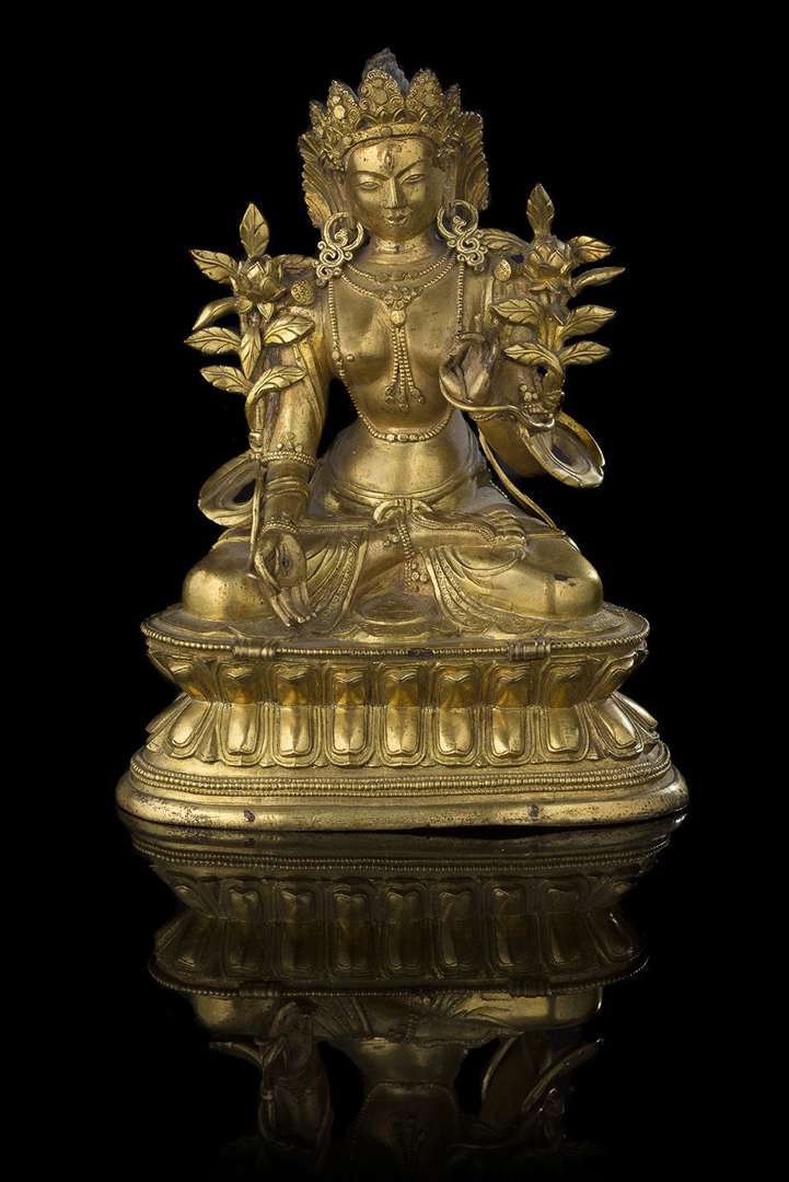 Statuette de Sita Tara en bronze doré. La divinité assise en vajrasana sur une double base lotiforme, la main droite en mudra du refuge et la main gauche en varada mudra tandis que deux tiges de lotus s'épanouissent sur ses épaules. Elle est vêtue d'un fin dhoti et parée de nombreux bijoux. La base non scellée.