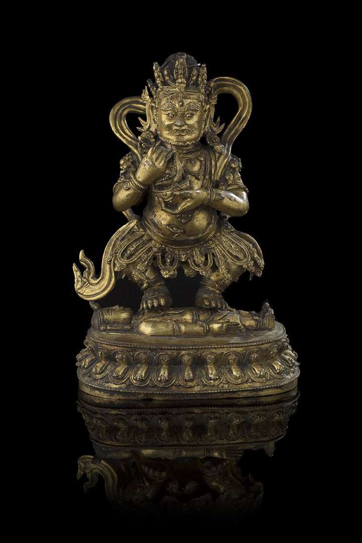 Statue de Panjarnarta Mahakala en bronze doré. Le yidam debout sur une double base lotiforme et piétinant un corps, les mains devant le torse tenant un kapala et un kartika. Le corps paré de nombreux bijoux, écharpes flottantes, la chevelure hirsute, les yeux exorbités, l'expression courroucée. La base non scellée.