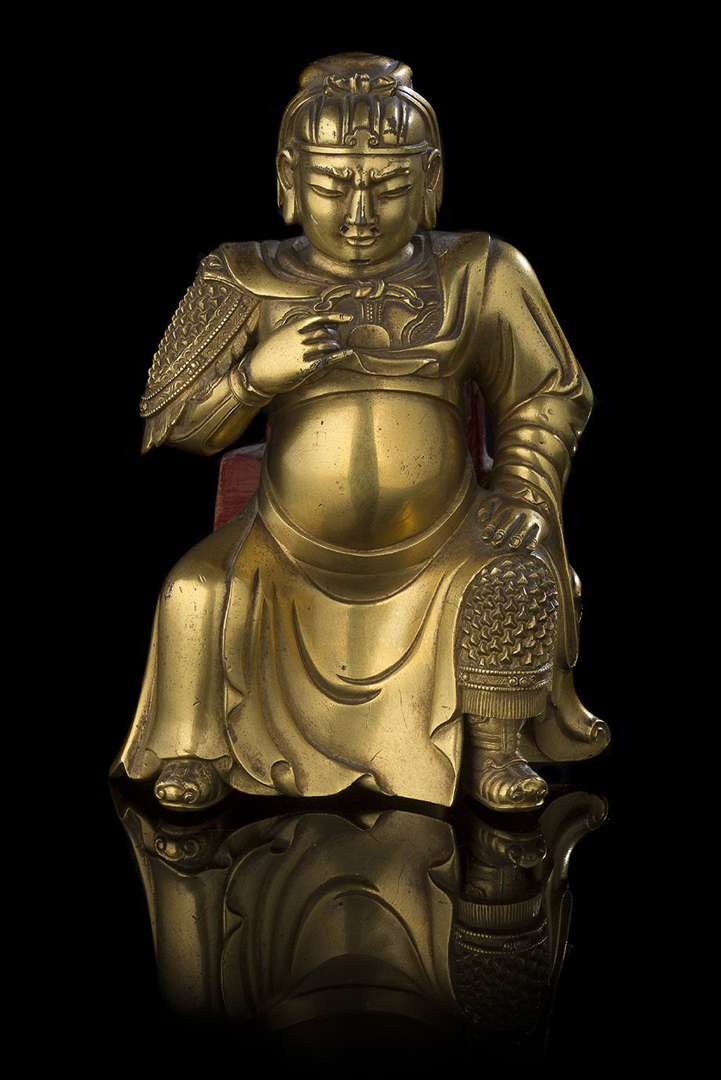 Statuette de Guandi en bronze doré. La divinité représentée assise, vêtu d'une cuirasse, une main ramenée devant la poitrine.