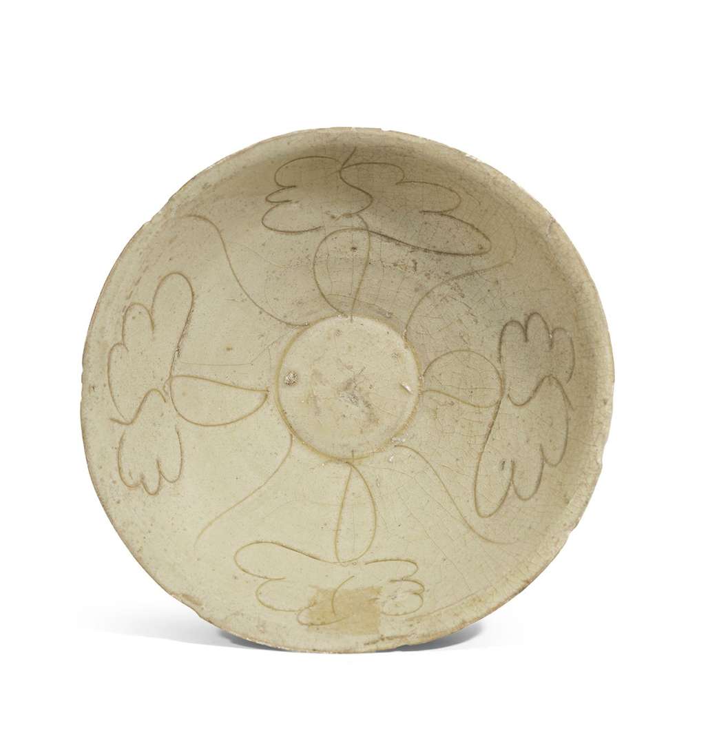 Bol en grès à couverte céladon de forme légèrement polylobée, l'intérieur incisé de motifs abstraits sous une fine couverte vert olive pâle translucide. Le pied avec des concrétions marines. Possiblement issu de l'épave du Jepara (Indonésie).