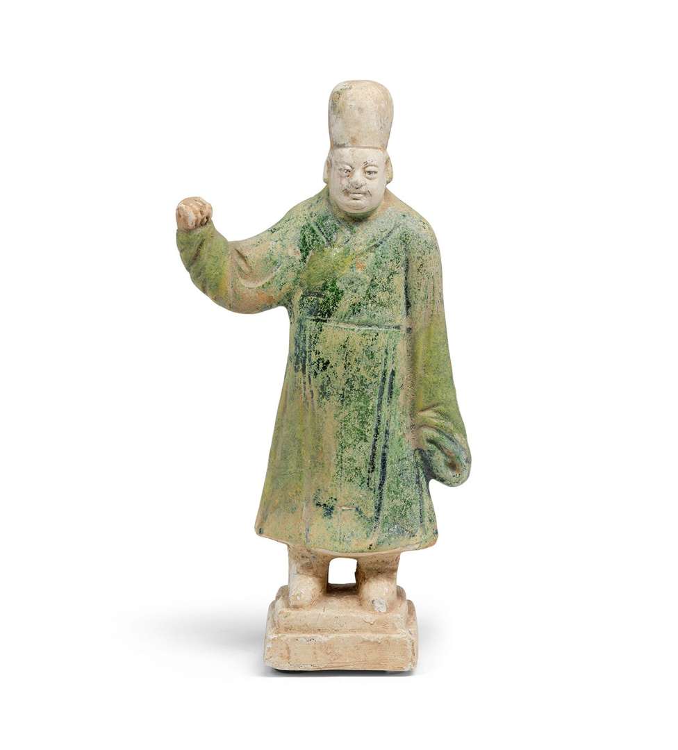 Mingqi en terre cuite partiellement glaçurée figurant un attendant debout.