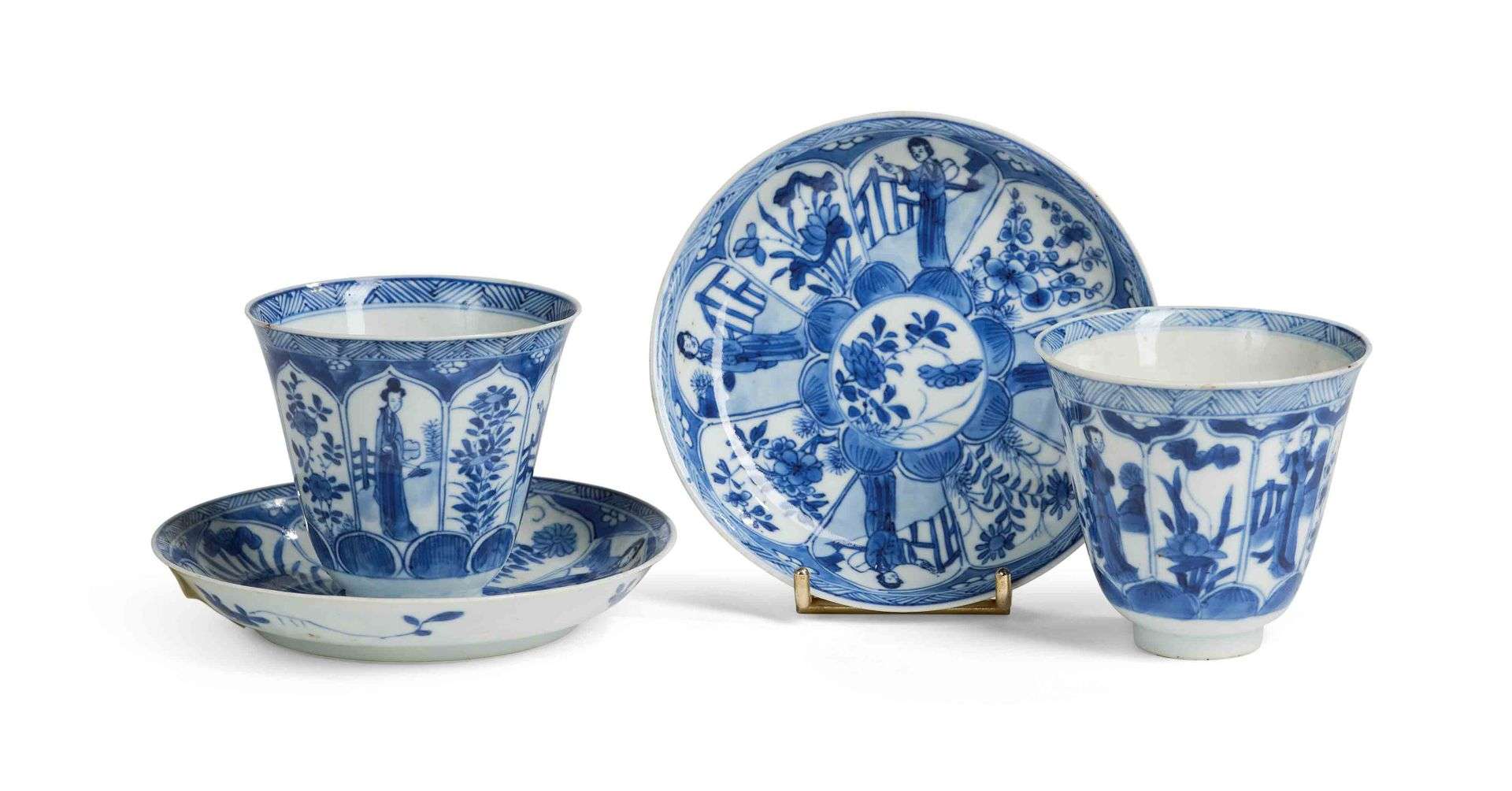 Paire de coupes et leurs soucoupes en porcelaine bleu-blanc. Les coupes de forme campanulée décorées de réserves alternant fleurs et élégantes dans des jardins. Les bases avec des marques « Yu » (Jade)