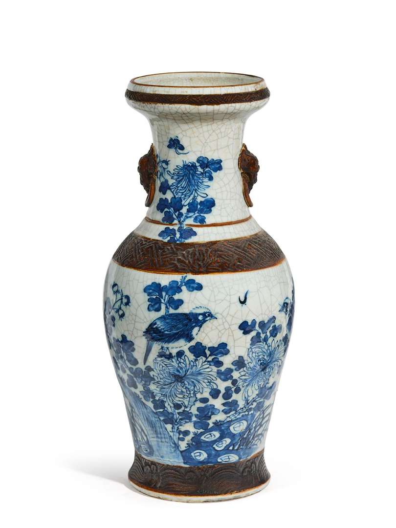 Vase en grès de Nankin à décor bleu-blanc. Le corps orné d'oiseaux parmi les chrysanthèmes et les rochers.