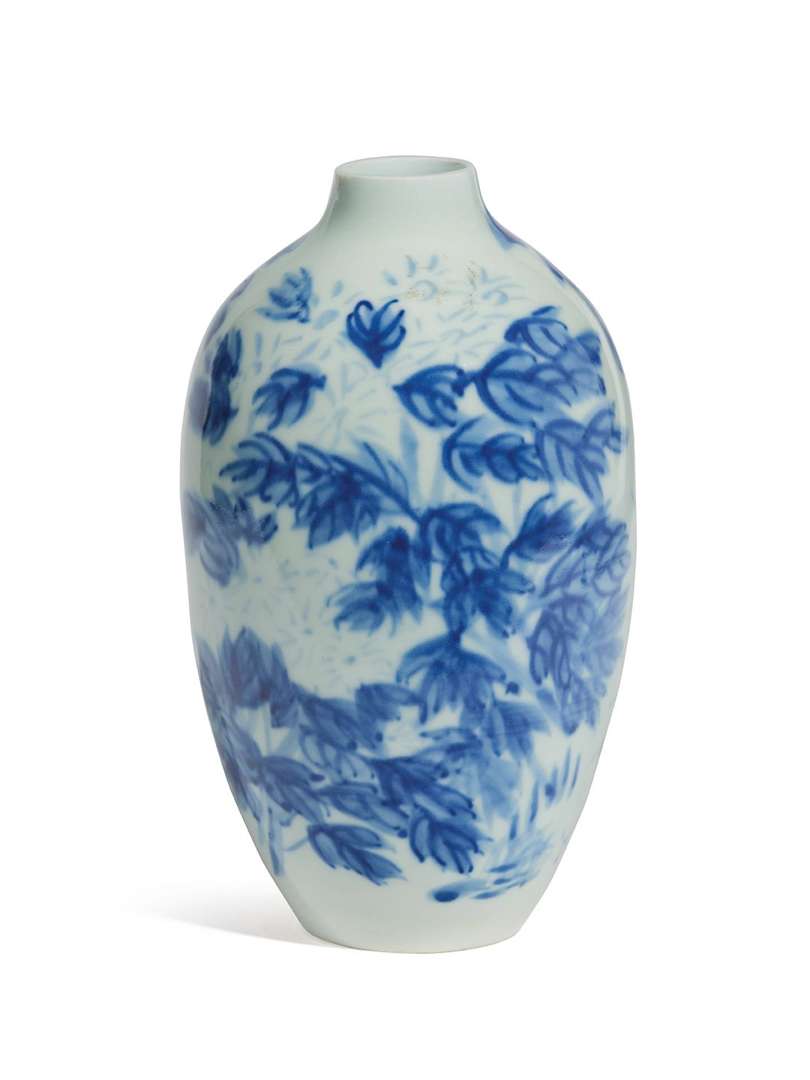Petit vase en porcelaine bleu-blanc de forme ovoïde, décoré d'oiseaux branchés librement peints.