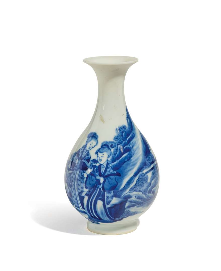 Vase-bouteille en porcelaine bleu-blanc décoré de deux élégantes dans un jardin. La base avec une marque Kangxi à quatre caractères en bleu sous couverte.