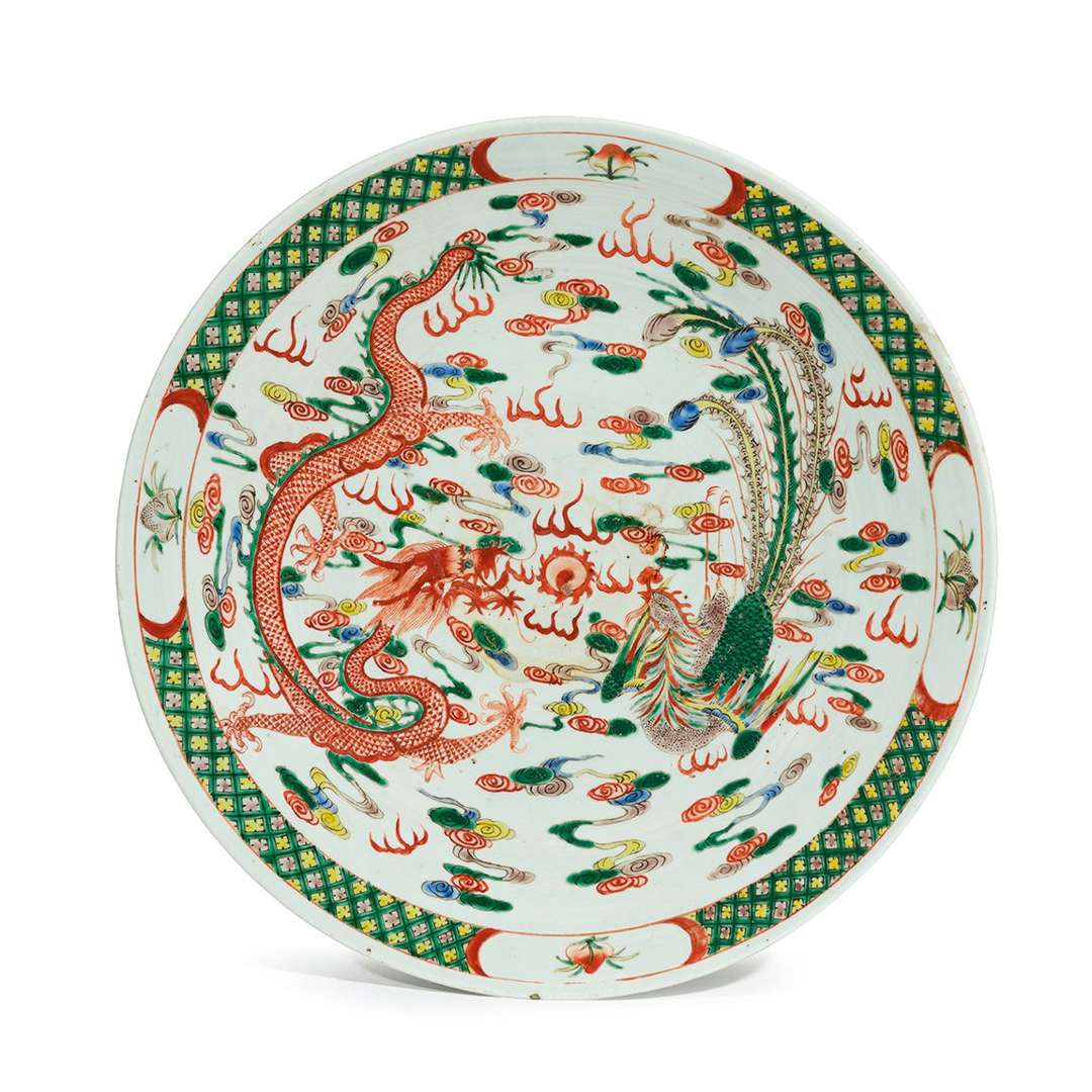 Plat en porcelaine de la famille verte décoré d'un dragon et d'un phénix pourchassant la perle sacrée parmi les nuées.