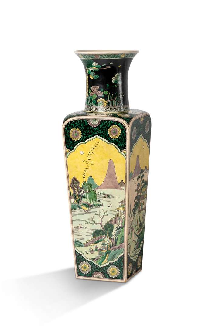 Important vase en biscuit décoré aux émaux de la famille noire de section carrée, chaque face décorée d'une importante réserve abritant un paysage lacustre. L'ensemble se détachant sur un fond de chrysanthèmes et rinceaux. La base avec une marque Kangxi à quatre caractères en bleu sous couverte.