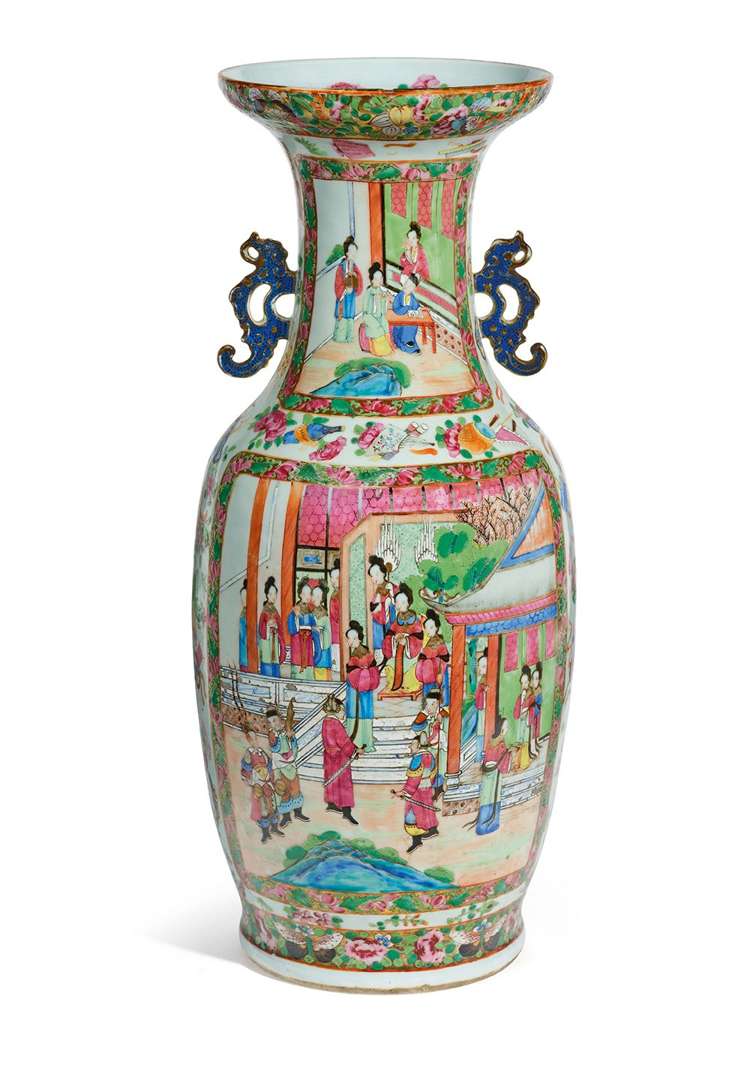 Important vase en porcelaine de Canton décoré de grandes réserves abritant des personnages dans des jardins. L'ensemble se détachant sur un fond de bouquets fleuris et symboles auspicieux. Le col haut et évasé flanqué de deux anses en forme de chilong archaïsants.