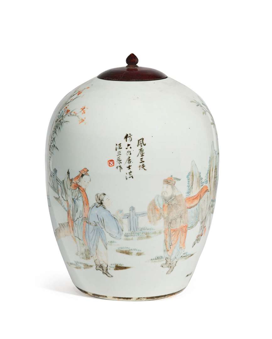 Pot à gingembre en porcelaine aux émaux polychromes de forme ovoïde, décoré des « Trois Héros du Vent et de la Poussière », Qiu Ran Ke, Li Jing et Hong Fu Nü. Avec son couvercle en bois naturel postérieur.