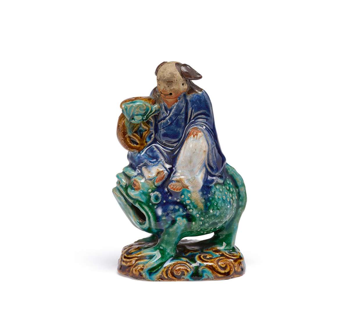 Porte-encens en grès de Shiwan figurant Liu Hai sur son crapaud à trois pattes, tenant une sapèque et une chauve-souris.
