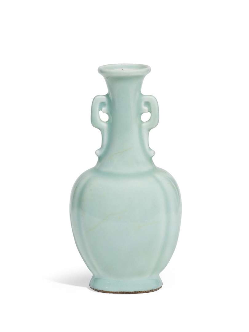 Vase en porcelaine monochrome céladon. Le corps quadrilobé reposant sur un court pied, le col élançé flanqué de deux petites anses de style archaïsant. La base avec une marque Qianlong à quatre caractères en zhuanshu en bleu sous couverte.