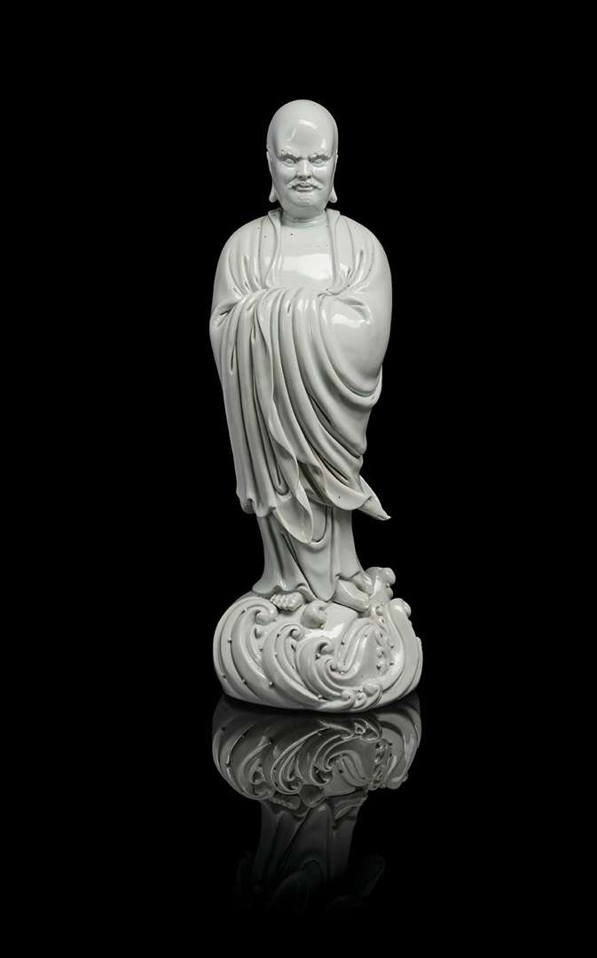 Statue de Bodhidarma en « Blanc-de-Chine ». Le maître figuré debout sur des flots, enveloppé dans un ample manteau aux plis ondulants. Avec une marque estampée « He yin chao zong » en zhuanshu au revers.