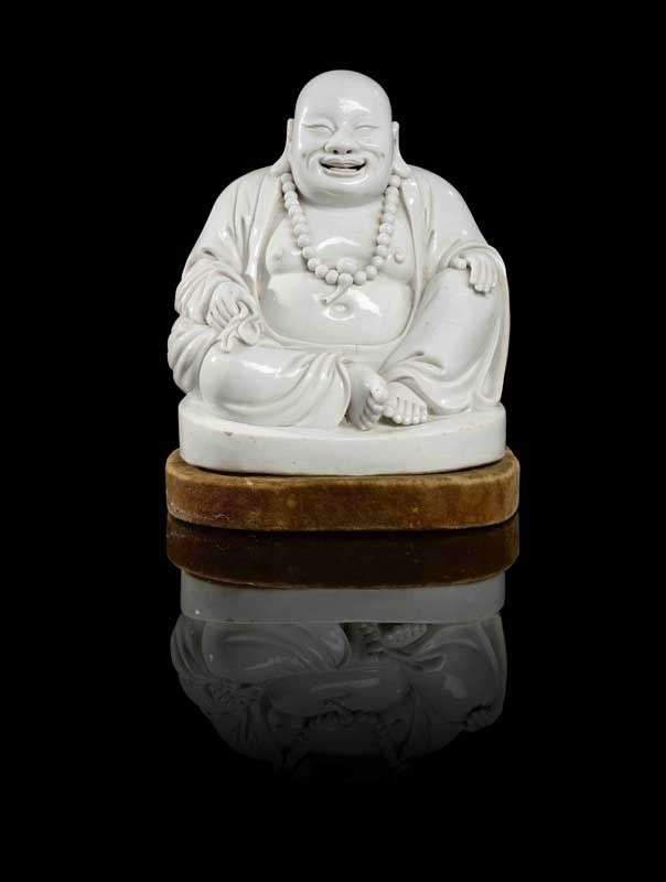Statue de Budai en « Blanc-de-Chine » représenté assis en rajalalitasana, vêtu d'un ample manteau et s'appuyant sur un grand sac de toile. Avec son socle postérieur.