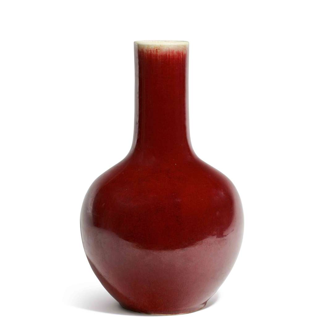 Important vase tianqiuping en porcelaine monochrome « sang-de-boeuf ». La couverte avec une belle teinte rouge profond.