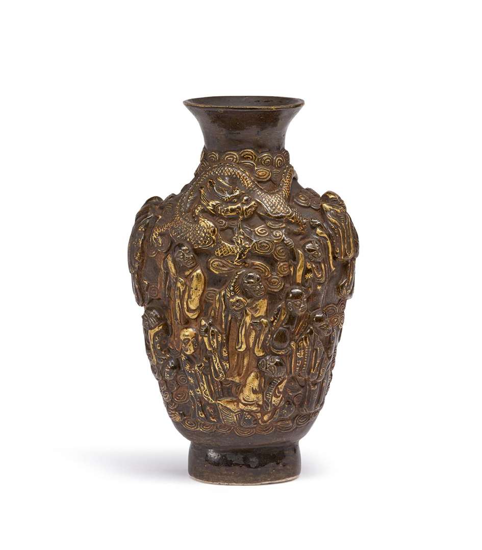 Le corps décoré en relief des dix-huit Luohan parmi les nuées. La porcelaine avec une belle couverte brun-vert rehaussée à l'or imitant le métal. La base avec une marque Kangxi à six caractères en zhuanshu.