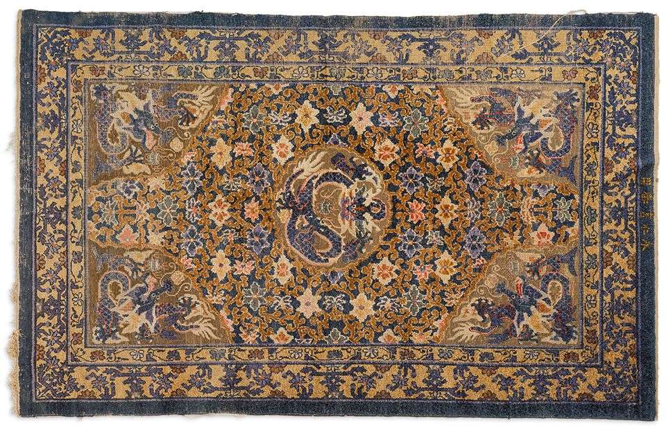 Important tapis de palais en laine, soie et fils métalliques dorés décoré de cinq dragons impériaux pourchassant la perle parmi de denses rinceaux floraux et feuillagés. Un dragon représenté de face au centre de la composition, les quatre autres dans des écoinçons. L'ensemble encadré par une bordure de rinceaux floraux. En partie supérieure, une marque « Yongren Gong Yuyong » (Pour l'usage impérial dans le Palais de l'Eternelle Bienveillance).