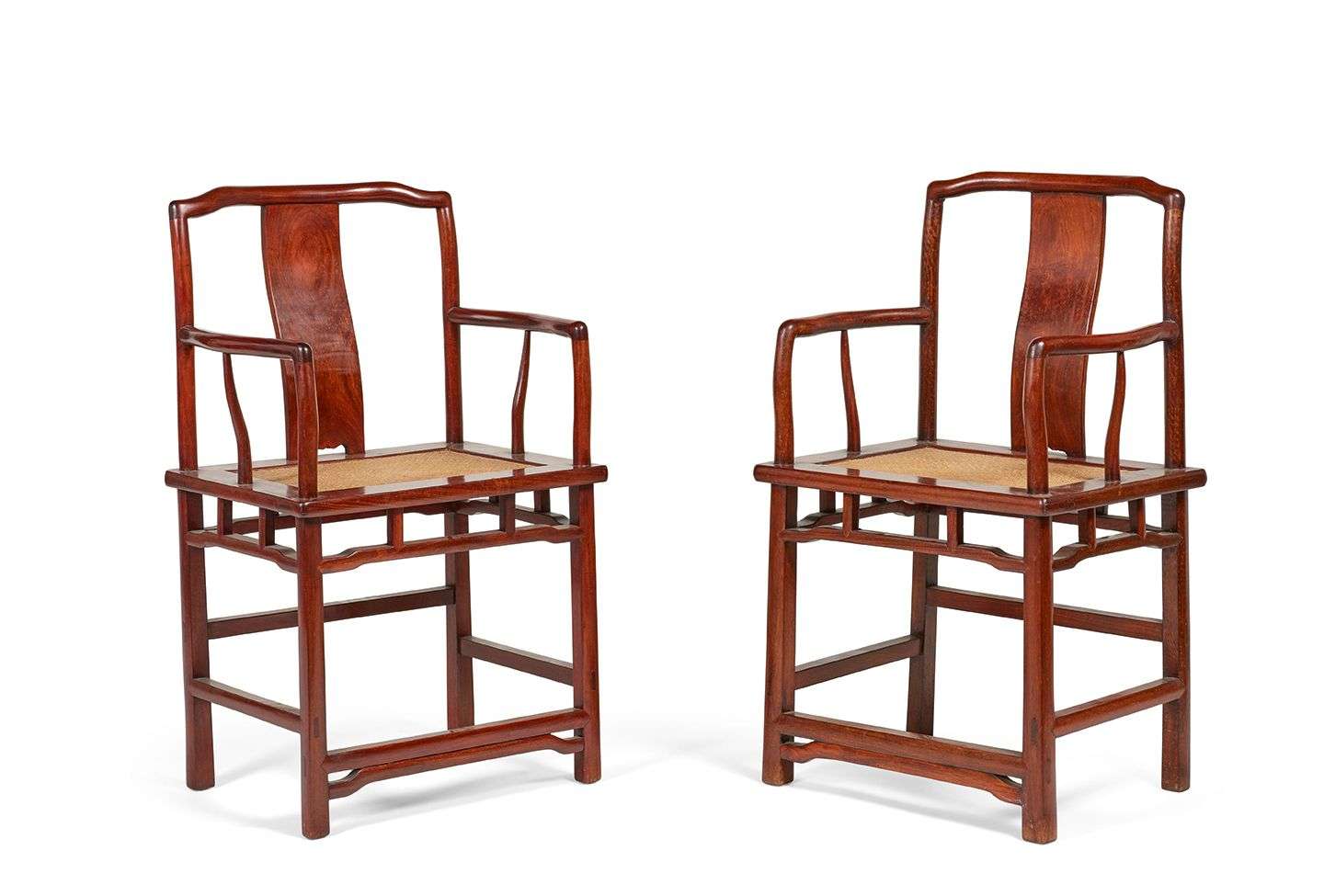 Paire de fauteuils en bois naturel. Le dossier en bonnet de lettré. Les assises en natte tressée.