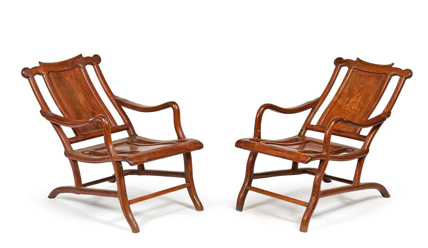 Paire de chaises longues en bois naturel.