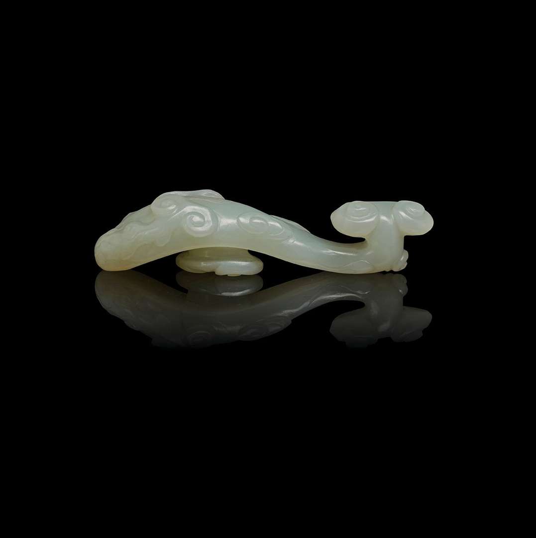 Fibule en jade céladon sculpté imitant la forme d'un sceptre ruyi et décoré de champignons lingzhi.