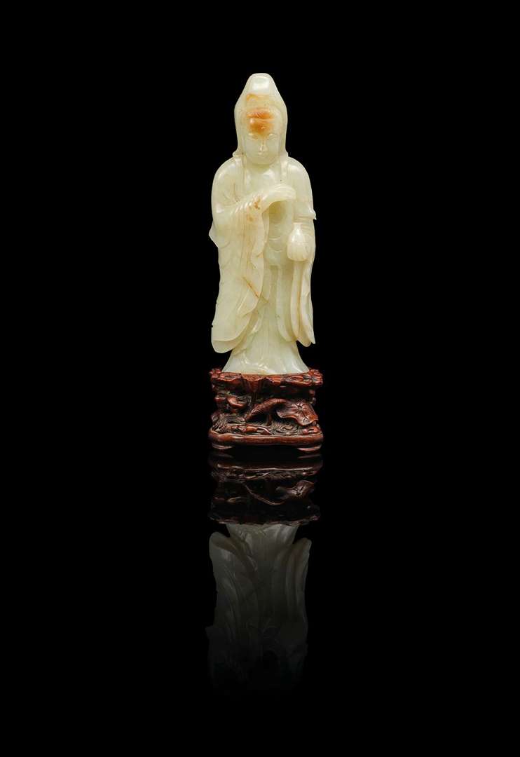 Statuette de Guanyin en jade sculpté. La bodhisattva figurée debout tenant un vase à eau lustrale, vêtu d'un ample manteau. Avec un socle en bois naturel sculpté à décor de rocher et lotus.