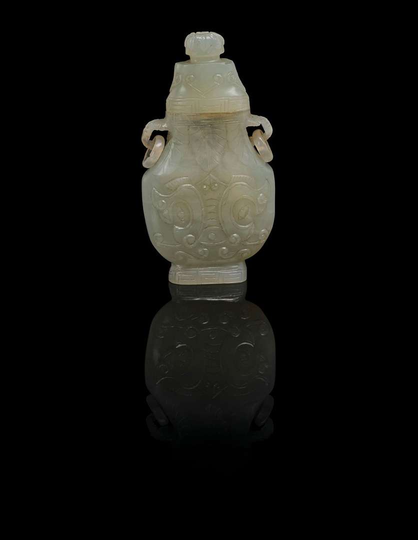 Petit vase couvert en jade céladon sculpté de forme balustre, décoré de masques de taotie et motifs archaïsants.