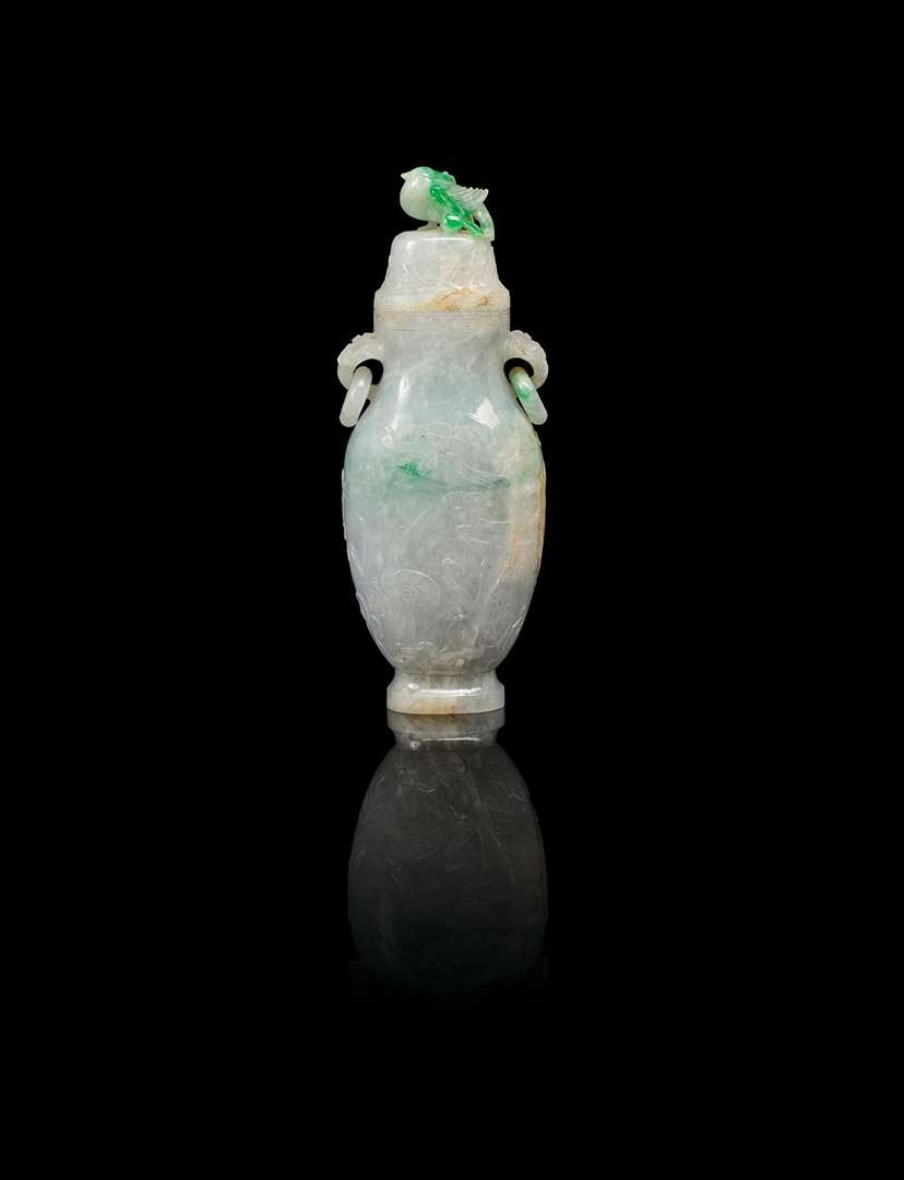 Petit vase couvert en jadéite sculptée de forme balustre, décoré de grue et phénix par les pin, bambou et pivoine. Le couvercle avec un bouchon en forme d'oiseau tenant une branche de pêches de longévité. Avec son socle en bois naturel incrusté de filets.
