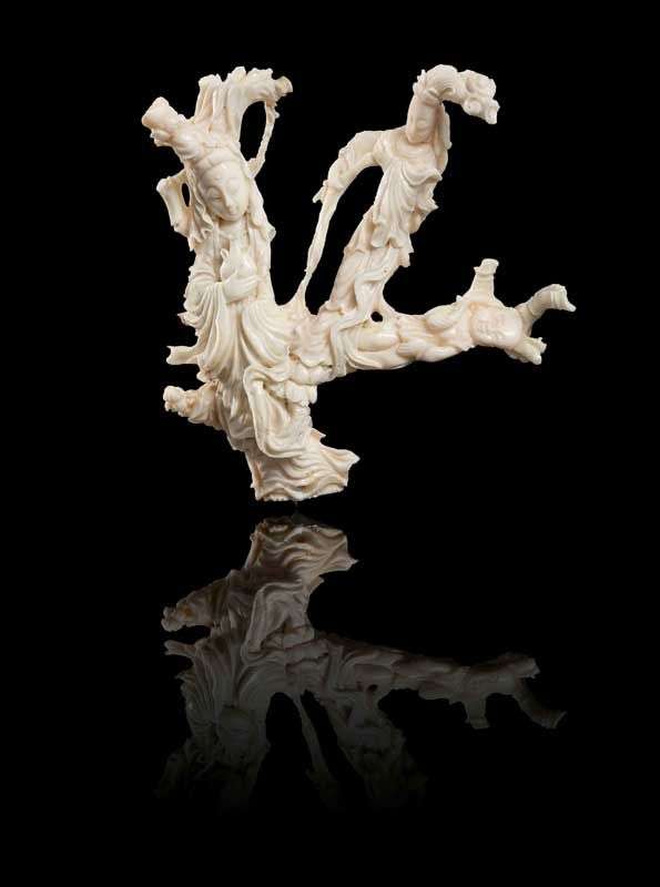 Groupe en corail blanc figurant la bodhisattva Guanyin accompagnée de deux attendants.