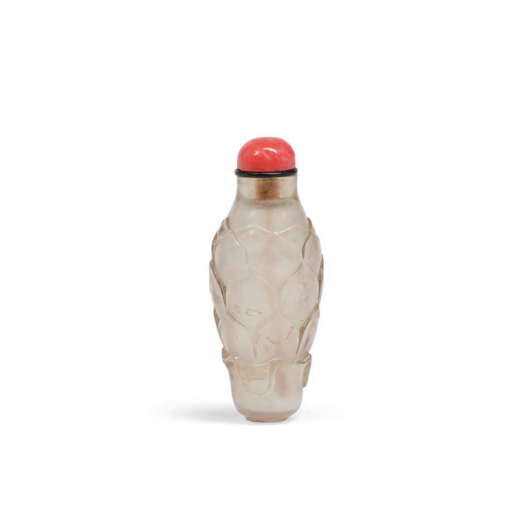 Flacon-tabatière en cristal de roche sculpté décorée de pétales de lotus superposés. Le bouchon en corail rose.