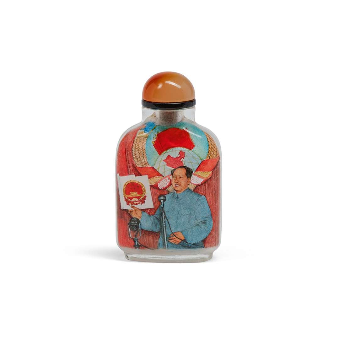 Flacon-tabatière en verre peint à l'intérieur. Une face décorée d'un portrait du président Mao Zedong prononçant un discours politique. Le revers avec une inscription évoqunt un discours de 1950 sur l'emblème national de la République Populaire de Chine. Datée du 11e mois lunaire de l'année Jiazi (1984) et signée Wang Chunguang. Le bouchon en agate sculptée.
