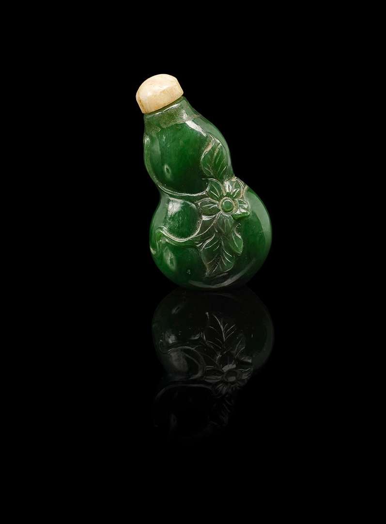 Flacon-tabatière en jade vert épinard sculpté en forme de double-gourde, avec des fleurs et vrilles. Le bouchon en pierre dure beige.