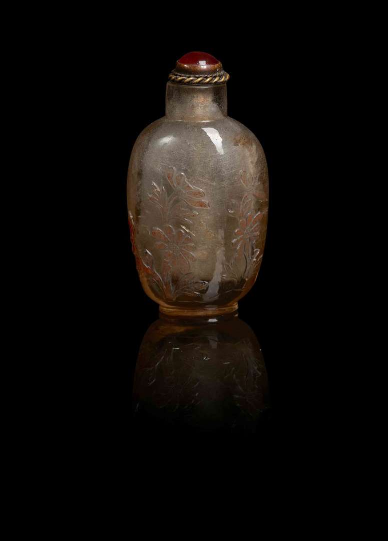 Flacon-tabatière en cristal de roche sculpté et gravé décoré de fleurs de chrysanthèmes et branches de prunus. Avec un bouchon et une palette en métal.