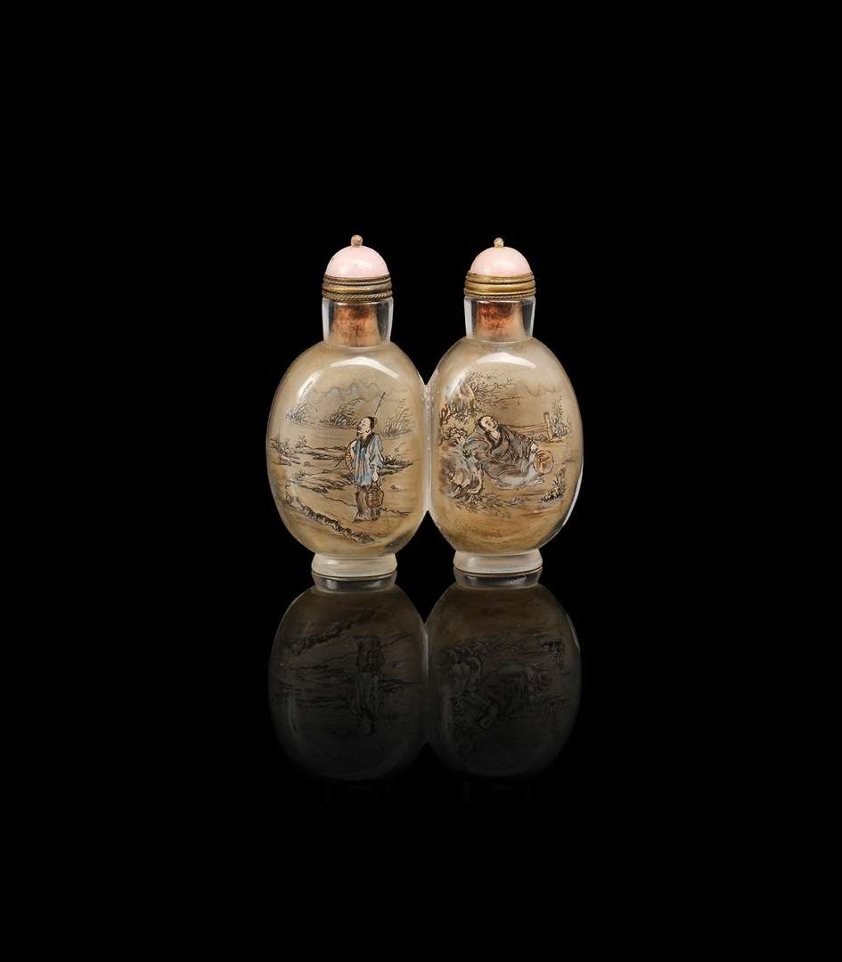 Double flacon-tabatière en verre peint à l'intérieur décoré de lettrés dans des paysages montagneux. Les bouchons en verre rose pâle. Daté année Renyin.