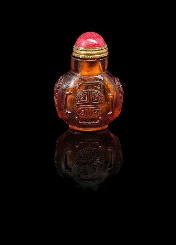 Petit flacon-tabatière en verre moulé marron. La panse gravée d'un caractère Shou stylisé. Le bouchon avec une pierre dure rouge.