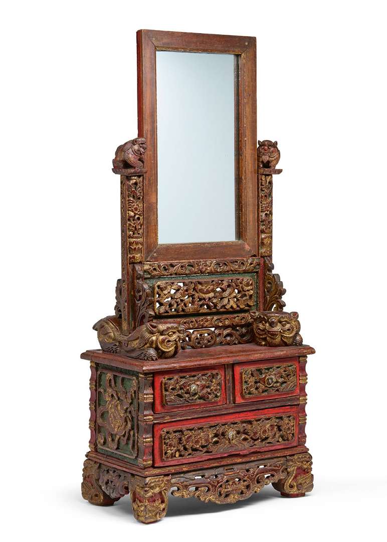 Coiffeuse en bois sculpté laqué rouge et or de style Peranakan ouvrant sur trois tiroirs en façade, la partie inférieure richement sculptée de fleurs et rinceaux, reposant sur quatre petites figures de lions bouddhiques. Le miroir, soutenu par des montants ornementés, reposant également sur deux lions bouddhiques.