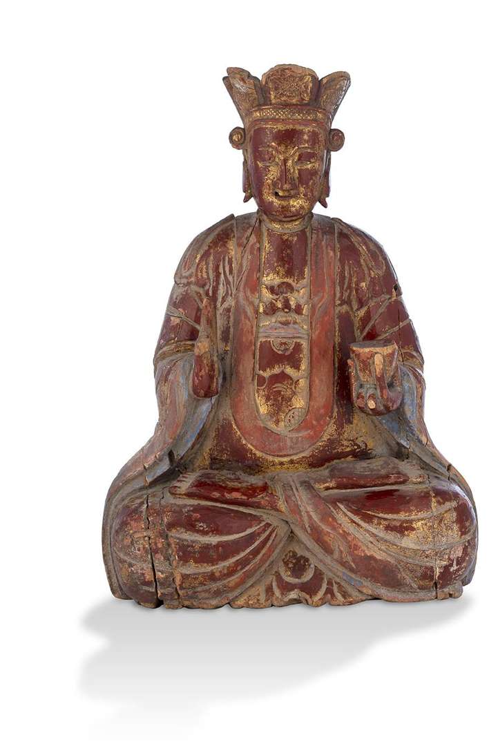 Statue de bodhisattava en bois laqué et partiellement figuré assis en padmasana, tenant un bol dans la main gauche. Le front ceint d'une haute couronne à décor de fleurettes et enroulements.