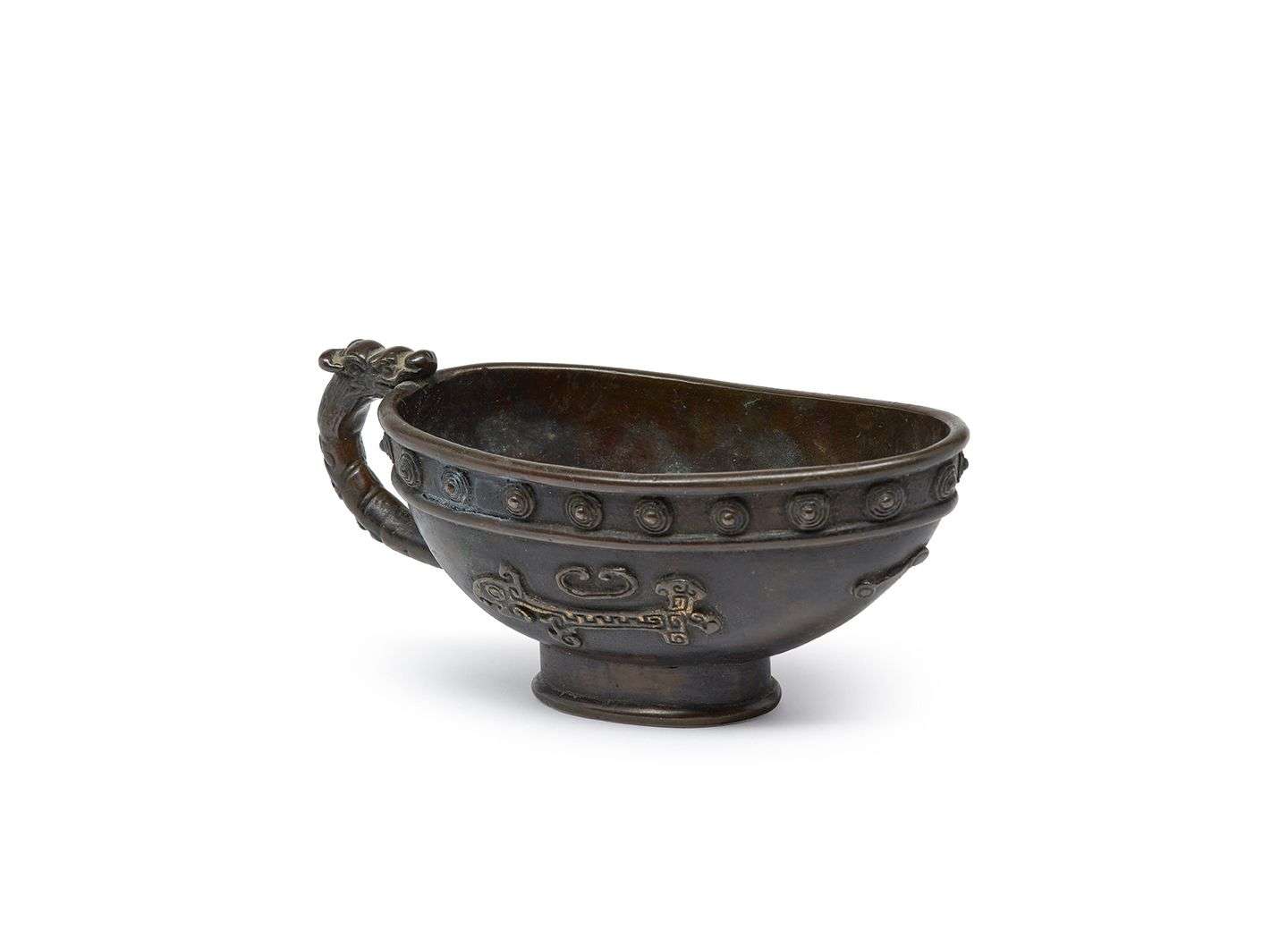 Coupe libatoire en bronze à patine brune de forme oblongue, ornée de motifs de carpe-dragon et constellations. La lèvre soulignée d'une frise de perles, l'anse figurant un dragon stylisé.