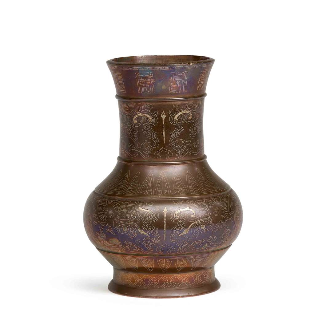 Vase en bronze à patine brune et incrustations d'argent décoré de masques de taotie et motifs de cigales stylisées. La base avec une marque Tai Xin Zhi Rong en zhuanshu dans un double carré.