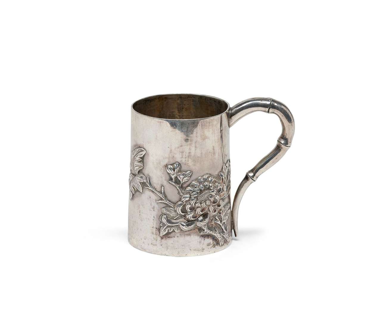 Petite tasse en argent repoussé. L'anse imitant la forme du bambou, le corps décoré de chrysanthèmes. La base avec la marque « 90WH » de l'orfèvre Huang Jiu Ji et une marque « Zhang Ba ».