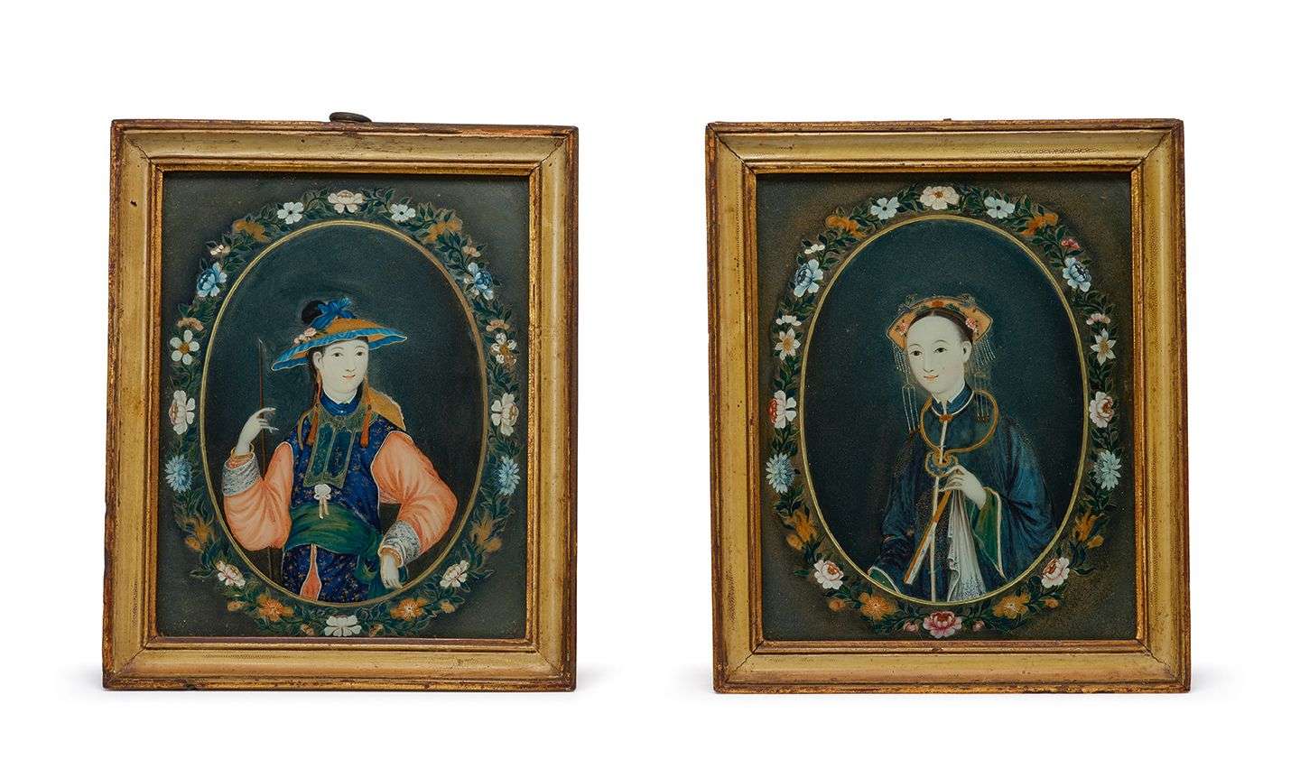 Paire de fixés sous verre. L'un figurant une élégante costumée en bergère et tenant une houlette. L'autre représentant une dame en costume chinois. Chacun des portraits en buste dans un encadrement ovale souligné par une guirlande de fleurs variées. Dans des encadrements en bois peint et doré.