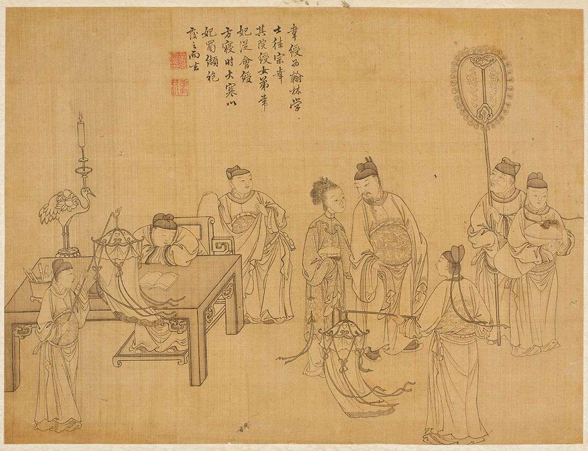 Grande feuille d'album. Encre sur soie figurant un couple entouré de nombreux attendants tandis qu'un lettré est endormi sur une table à proximité. L'ensemble accompagné d'un texte calligraphié, avec deux sceaux.