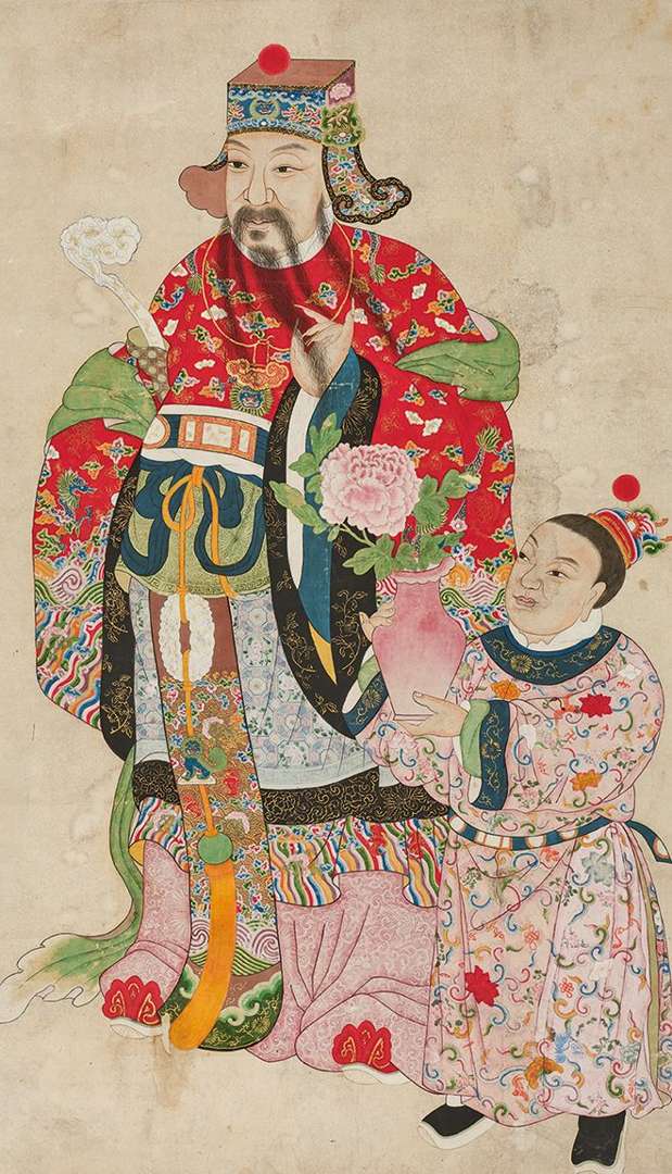 Rouleau vertical figurant Fu Xing. Encre et couleurs sur papier. Le dieu du Bonheur représenté debout, vêtu d'une ample robe bariolée, coiffé d'un chapeau à ailettes et tenant une sceptre ruyi. Il est accompagné d'un jeune attendant présentant un vase où s'épanouit une pivoine.