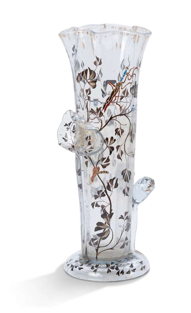 Corps conique à col évasé polylobé, en verre translucide, à décor émaillé or et polychrome de mantes religieuses et insectes sur fond végétal, inclusions de fleur et boutons de fleur en application à chaud.