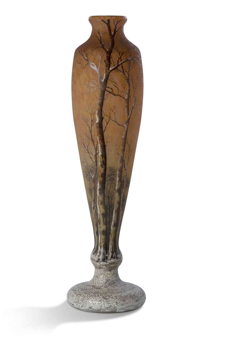 A large baluster vase on a pedestal, multilayered glass with acid-etched and enamelled decoration. Signed and numbered.