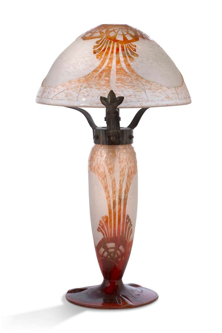 A mushroom lamp in red, orange and green multi-layered glass on white background, with acid-etched decoration. Signed.
