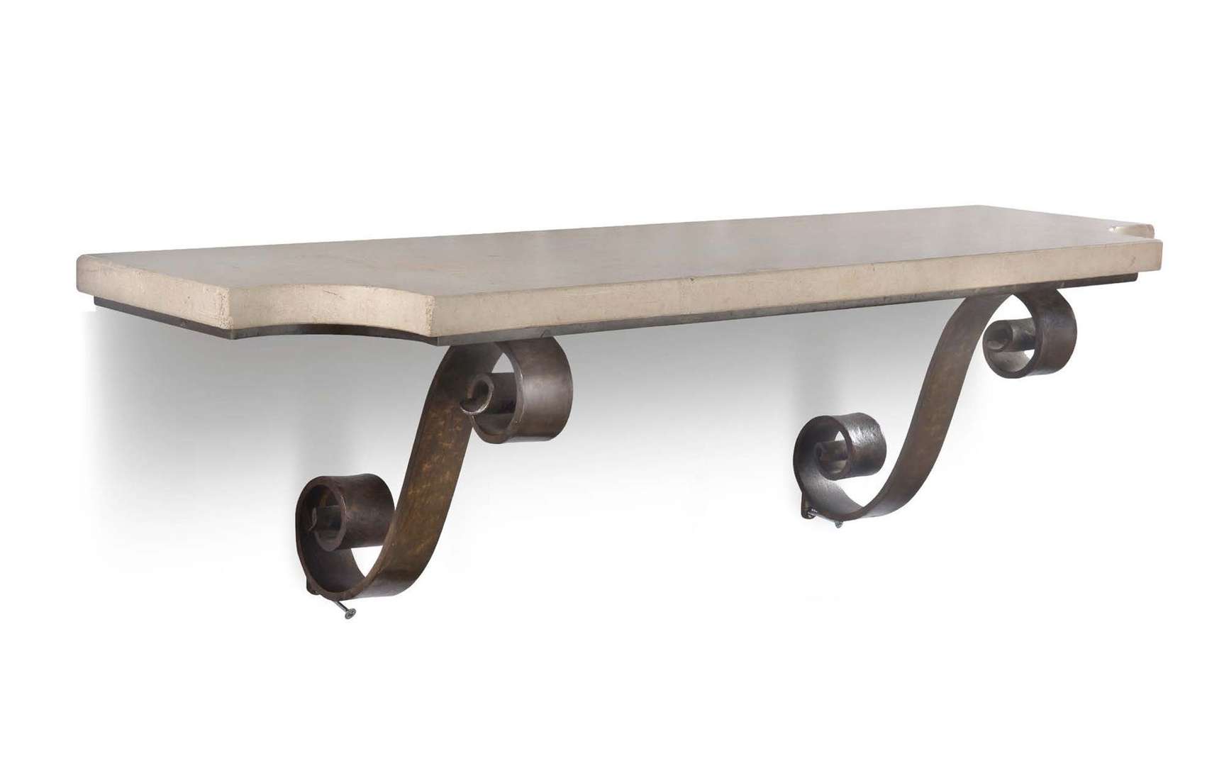 A wall console, c. 1938, hammered iron and patinated copper structure, stone top.