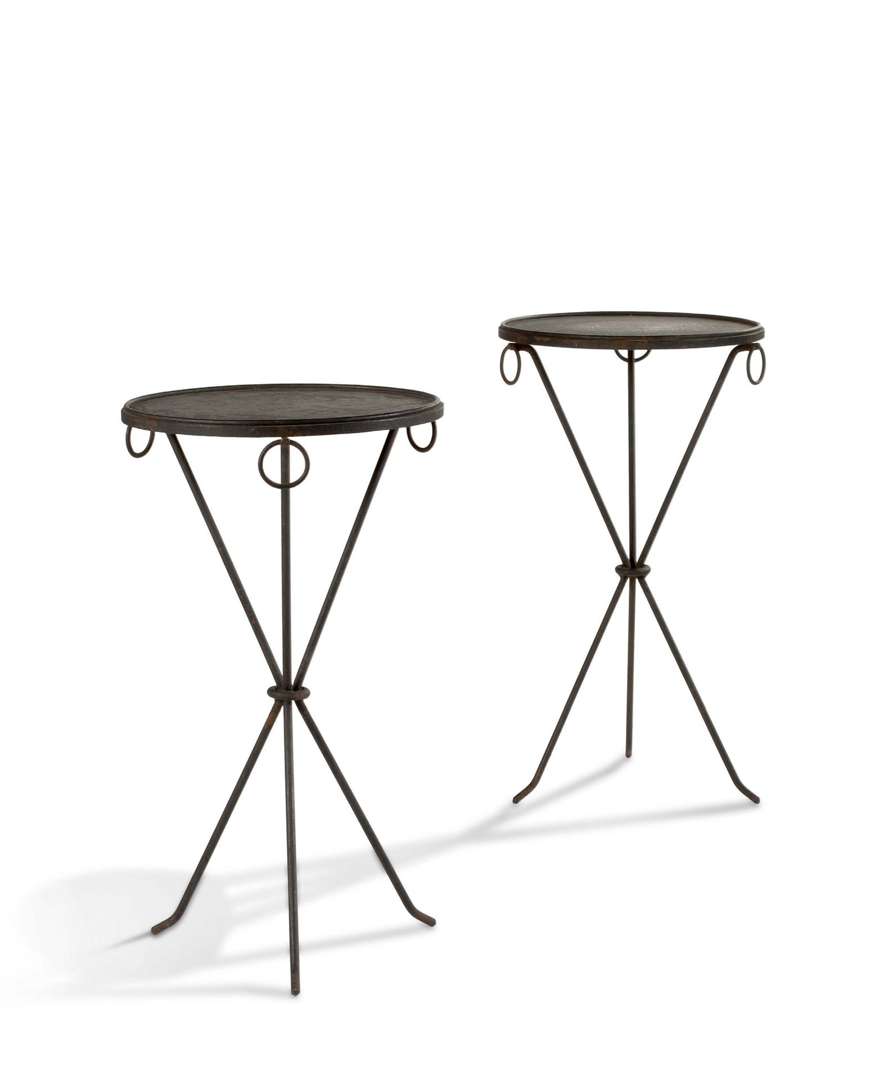 A pair of pedestal tables, model designed c. 1935, in blackened iron.